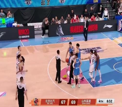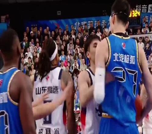 第四節賽場突發火藥味!比賽還剩下8分鐘34秒,山東外援珀賽爾殺入北京隊禁區,一躍而起雙腳騰空隔扣了周琦,
