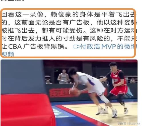付政浩同時表示“賴俊豪搶斷后已經(jīng)控制住了球權(quán),李祥波是否沒必要再在他背后發(fā)力推那一下,值得商榷。職業(yè)球員在努力贏球的同時盡量注意保護一下對手。”;“賴俊豪的身體是平著飛出去的,這前面無論是否有廣告板,他以這種姿勢被推飛出去,都有可能受傷。這種在對方運動時在背后發(fā)力推人的寸勁是有風險的,不能只讓CBA廣告板背黑鍋。”。