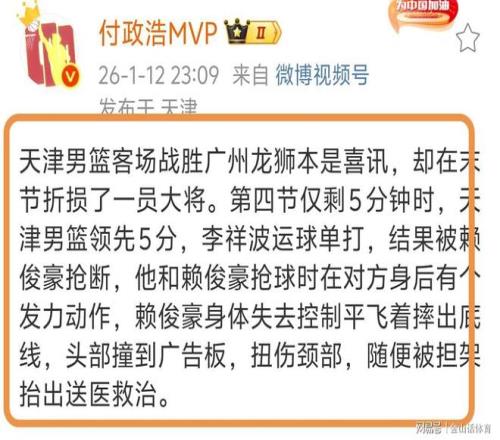 賽后,著名媒體人付政浩還原了事情真相,他在個人社媒上,詳盡解讀的賴俊豪受傷的過程。“龍獅本是喜訊,卻在末節(jié)折損了一員大將。第四節(jié)僅剩5分鐘時,天津男籃領(lǐng)先5分,李祥波運球單打,結(jié)果被賴俊豪搶斷,他和賴俊豪搶球時在對方身后有個發(fā)力動作,賴俊豪身體失去控制平飛著摔出底線,頭部撞到廣告板,扭傷頸部,隨便被擔架抬出送醫(yī)救治。”。