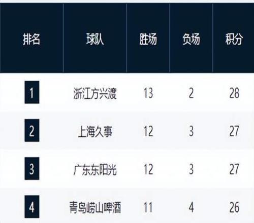 積分榜前三名依舊由廣廈、上海和廣東三隊把持。衛冕冠軍廣廈隊憑借一波4連勝,以13勝2負的戰績獨占鰲頭,領先廣東隊1個勝場。上海隊以12勝3負的戰績緊隨其后,位列第2名。廣東隊則在上一輪40分慘敗給上海隊后,戰績同為12勝3負,但因交鋒戰績劣勢暫居第3名。