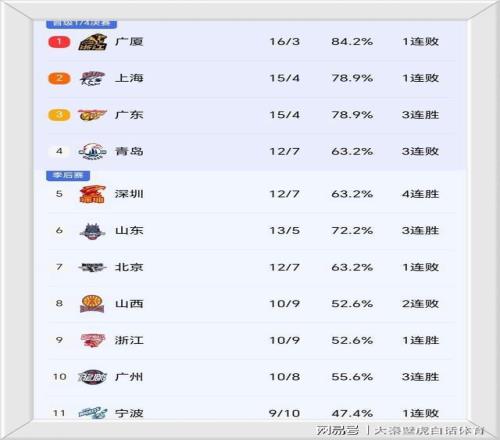 ①、廣廈+上海+青島集體輸球,排名仍位居前4,四連勝的深圳隊勝場數已經追平青島;