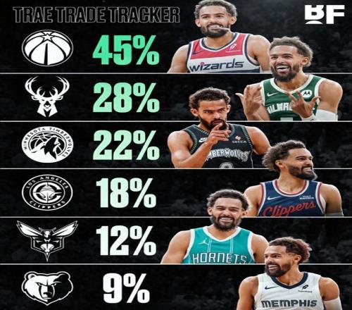 特雷楊潛在下家有6支,分別是奇才、雄鹿、森林狼、快船、黃蜂和灰熊。6支隊(duì)伍中特雷楊加盟奇才的概率最高達(dá)到45%,排名第二的是雄鹿和森林狼。令人意外的是,6支球隊(duì)中一支爭冠隊(duì)都沒有,最好的森林狼也不過西部第6名,最差的奇才東區(qū)倒數(shù)第二。