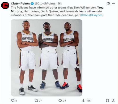 賽前傳來了一個(gè)消息,根據(jù)《雅虎體育》記者克里斯-海恩斯的消息,鵜鶘隊(duì)已經(jīng)告知聯(lián)盟各隊(duì),在交易截止日前:錫安、墨菲、奎因、費(fèi)爾斯、赫伯特-瓊斯五人都會(huì)留在鵜鶘陣容中,這5人之外的球員才能被交易。