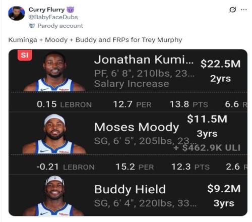 勇士媒體還在憧憬用穆迪+希爾德+庫明加+1個(gè)首輪簽去換墨菲,他們的如意算盤就這樣落空了,說實(shí)話這三人對(duì)于鵜鶘陣容來說的確沒有什么大用,而且薪資也不匹配,墨菲今年只有2500萬的年薪。