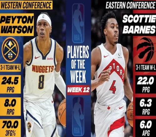 NBA官方公布了第12周的東西部周最佳球員,東部由猛龍前鋒巴恩斯當選,西部由掘金后衛沃特森當選。巴恩斯上周場均貢獻22分+6.3籃板+6助攻,帶領猛龍取得3勝1負的戰績。據統計,這是巴恩斯生涯第2次拿到該獎項。沃特森上周場均砍下24.5分+8籃板+4助攻+1.3搶斷+1.8蓋帽,三分球命中率高達70%,帶領掘金隊取得3勝1負的戰績。據統計,這是沃特森生涯首次獲此殊榮。除此之外,布倫森、大帝、加蘭、杰倫約翰遜、內姆哈德、阿夫迪亞、布克、華子、SGA和小卡等球星獲得了周最佳提名。