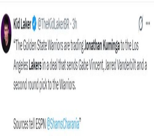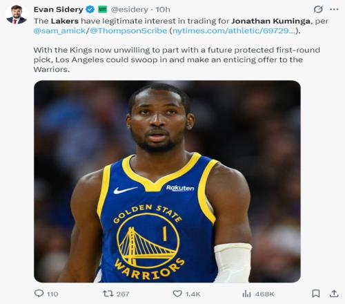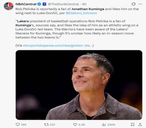 BR記者杰克-費舍爾透露,湖人隊在2025年的交易截止日前就已經開始關注庫明加,因為他們需要側翼球員的支持。湖人隊急需運動能力出眾的側翼已經是眾所周知的消息,湖人非常看重庫明加這位身體素質出色的3-4號位。去年夏天湖人在庫明加跟勇士鬧矛盾時就已經詢價過,湖人對庫明加的興趣已經持續了一年。