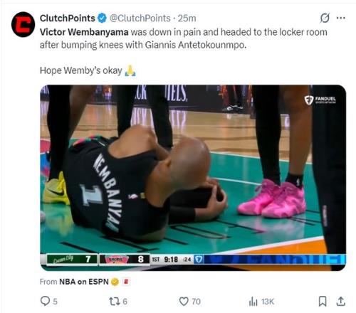 開場2分鐘光頭文班亞馬就在一起防守中跟揚尼斯的膝蓋發生碰撞,文班亞馬倒地不起,隨后文班亞馬下場檢查。字母哥毫發無損單節6分37秒,5中4+三分1中1+罰球6中5拿到14分2籃板1助攻2搶斷,字母哥在場時還領先1分。