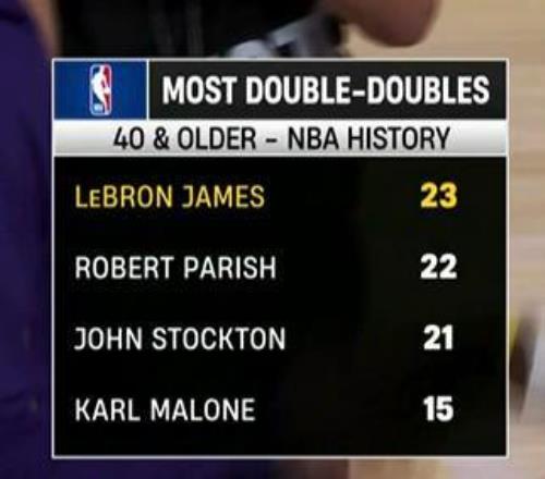 直播期間,轉播方曬出了NBA歷史上球員在40歲后兩雙次數排行榜,在這一榜單中,詹姆斯以23次位居榜首。