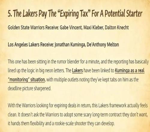 美媒《Fadeaway World》撰文建議,湖人應該考慮打包送出文森特、克萊伯以及克內克特,從勇士引入庫明加和梅爾頓。