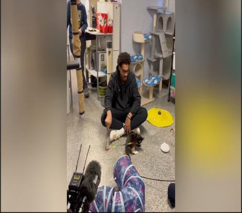 從志愿者手中接過一個色彩鮮艷的逗貓棒,與流浪貓玩耍。
