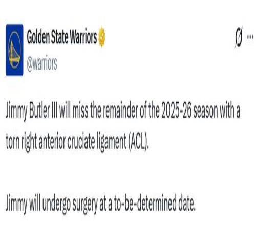北京時間1月21日,勇士官方發布聲明,前鋒吉米-巴特勒因右膝前交叉韌帶撕裂,將缺席2025-26賽季的剩余所有比賽。巴特勒是在昨日對陣邁阿密熱火的比賽第三節還剩7分41秒時受傷的,勇士隊最終以135-112獲勝。他將在擇期接受手術。