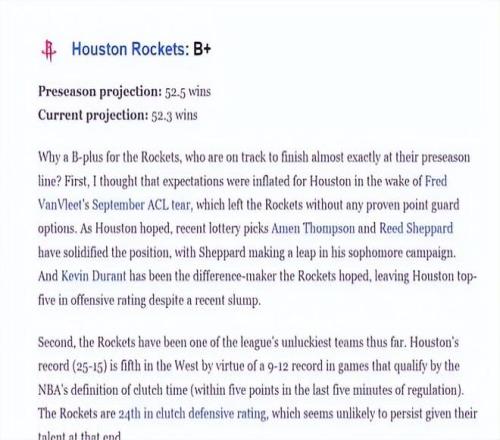 針對這樣一份半程戰(zhàn)績,今日美媒ESPN給火箭打出了B+的高分。