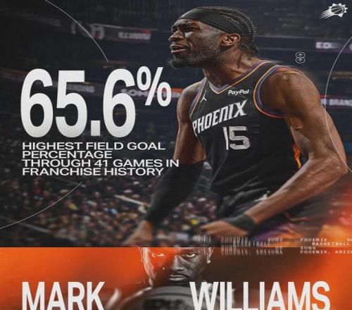 今天聊聊太陽(yáng)中鋒馬克-威廉姆斯,昔日的玻璃中鋒,本賽季也恢復(fù)健康了。加盟太陽(yáng)之前,馬威出勤率最高的一個(gè)賽季只打了44場(chǎng)常規(guī)賽。本賽季至今,馬威已經(jīng)打了39場(chǎng)常規(guī)賽,只缺席了5場(chǎng),他肯定能打破生涯出勤率紀(jì)錄。