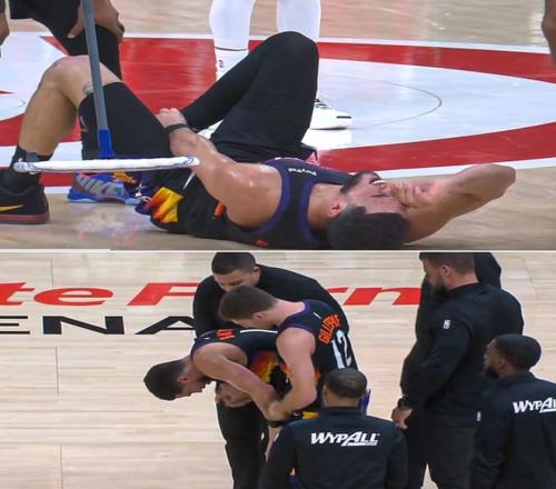 對比雄鹿隊,太陽隊今天更加慘烈,球隊兩大核心巨星布克和杰倫·格林在同場比賽中雙雙遭遇傷退。杰倫·格林僅僅出戰4分鐘就退場了,而布克狂砍31分后,第三節結束前5秒不慎踩到對手腳部,導致右腳踝90度嚴重扭傷,預計至少將缺席數周的時間,這對于狀態正佳的太陽來講,可謂是毀滅式的打擊。