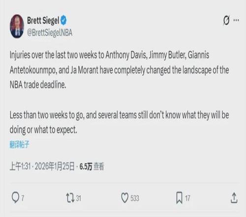 NBA記者Brett Siegel今天寫道:“最近兩周,安東尼-戴維斯、吉米-巴特勒、字母哥和莫蘭特接連受傷,徹底改變了NBA交易格局。距離交易截止日還有不到兩周,但很多球隊仍然不知道他們要做什么,也不知道接下來會發生什么。”