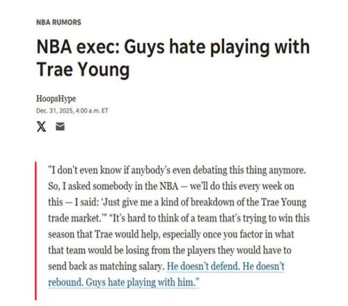 《The Ryen Russillo Show》節目主持人Ryen Russillo也給出類似說法,他公開表示一名高管談及特雷楊交易可能時直言:“沒有爭冠級別球隊將其視作合理補強對象,尤其是考慮到交易配平問題,他根本不防守,也不拼搶籃板,隊友們都不愛和他一起打球。”