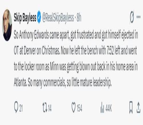 名嘴斯利普-貝勒斯也朝著愛德華茲開炮:年終大戰對陣掘金華子就情緒失控、心態爆炸被直接驅逐。此役在亞特蘭大老家被家鄉球隊胖揍,在末節還剩7分52秒提前離場,各種商業代言接不斷,領袖擔當卻看不到。