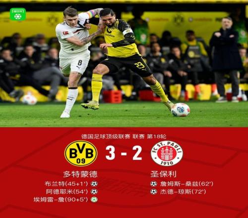 北京時間1月17日,德國足球甲級聯賽第18輪,多特蒙德坐鎮主場迎戰圣保利。上半場補時階段,阿德耶米送出助攻,布蘭特冷靜破門,為主隊先拔頭籌。易邊再戰,法比奧-席爾瓦送出關鍵傳球,阿德耶米接球后攻門得手,將比分擴大。此后圣保利展開反擊,埃里克-史密斯先后兩次送出助攻,詹姆斯-桑茲與杰德-瓊斯接連破門,幫助客隊連追兩球,將比分扳平。比賽進入傷停補時階段,多特蒙德獲得點球機會,埃姆雷-詹主罰命中,完成絕殺。最終全場比賽結束,多特蒙德以3比2戰勝圣保利。