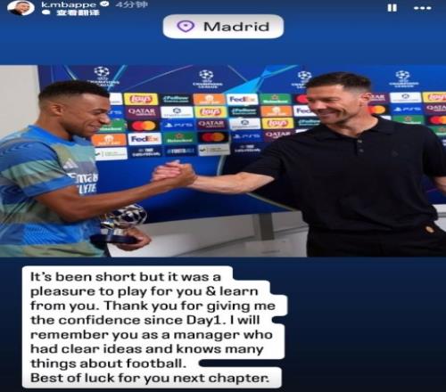 值得注意的是,姆巴佩是首位發文的皇馬球員。???姆巴佩曬出與阿隆索的握手照寫道:“雖然時間短暫,但能為您效力并向您學習,我感到非常榮幸。感謝您從一開始就給予我的信任。我會永遠記住您是一位思路清晰、對足球了如指掌的教練。祝您在人生的下一個階段一切順利。”