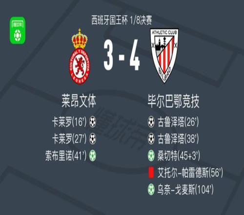 北京時間1月14日西班牙國王杯 1/8決賽,萊昂文體對陣畢爾巴鄂競技。萊昂文體卡萊羅梅開二度,索布里諾破門。畢爾巴鄂競技古魯澤塔梅開二度,桑切特破門,烏奈-戈麥斯破門。最終比分萊昂文體 3-4 畢爾巴鄂競技。