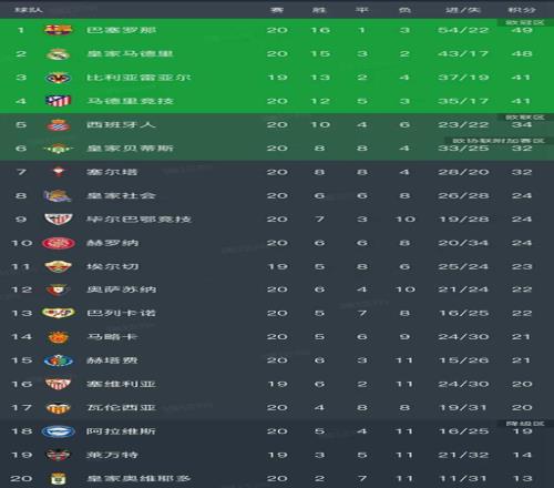 西甲第20輪結束了9場比賽,最新積分榜如下!