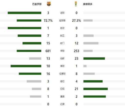 易邊再戰,巴薩在第52分鐘打破場上平衡,前場搶斷后,給了奧爾莫禁區內起腳的機會,后者低射打遠角建功,幫助巴薩取得了1-0的領先,5分鐘之后,皇家奧維耶多再次送出大禮包,后衛回傳失誤,直接給了拉菲尼亞單刀機會,巴西前鋒笑納大禮,幫助巴薩將優勢擴大到了2球。