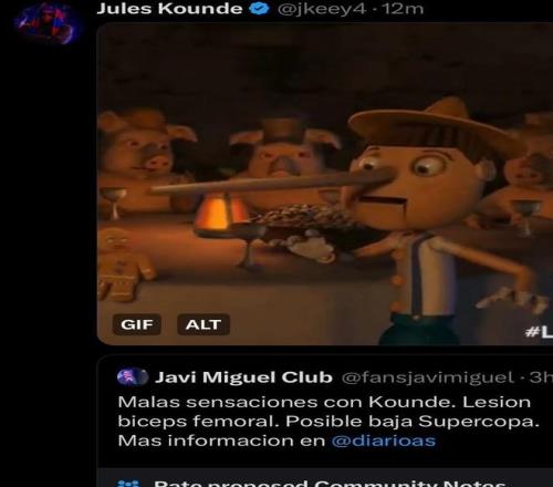 記者稱孔德受傷將缺戰西超杯,球員社媒發匹諾曹表情回應