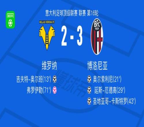 北京時間1月16日,意大利足球頂級聯賽第16輪,維羅納坐鎮主場迎戰博洛尼亞。比賽開局階段,貝內德送出助攻,吉夫特-奧爾班破門得分,幫助維羅納取得領先。隨后博洛尼亞迅速做出回應,弗羅伊勒助攻奧爾索利尼完成進球,將比分扳平。緊接著,本哈明-多明格斯送出傳球,延斯-厄德高推射建功,博洛尼亞反超比分。臨近上半場結束,波貝加送出精準助攻,圣地亞哥-卡斯特羅冷靜破門,進一步擴大領先優勢。進入下半場,弗羅伊勒不慎自擺烏龍,為維羅納追回一球。此后雙方均未能改寫比分,最終全場結束,維羅納2-3不敵博洛尼亞。