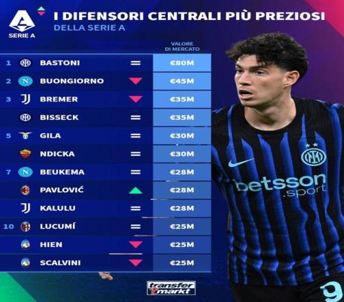 意甲中衛身價前10:巴斯托尼8000萬斷檔第1,早安哥4500萬第2