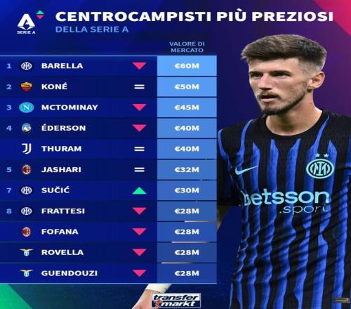 德轉意甲中場身價前10:巴雷拉6000萬第1,科內,小麥二三位