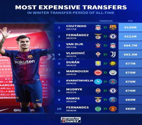 北京時間1月3日,德轉列出了冬窗歷史最貴的10筆交易,巴塞羅那在2018年冬窗1.35億歐元從利物浦引進庫蒂尼奧高居第一,切爾西2023年冬窗1.21億歐元從本菲卡引進恩佐-費爾南德斯排名第二,這也是冬窗歷史僅有的兩筆超過1億歐元的交易。