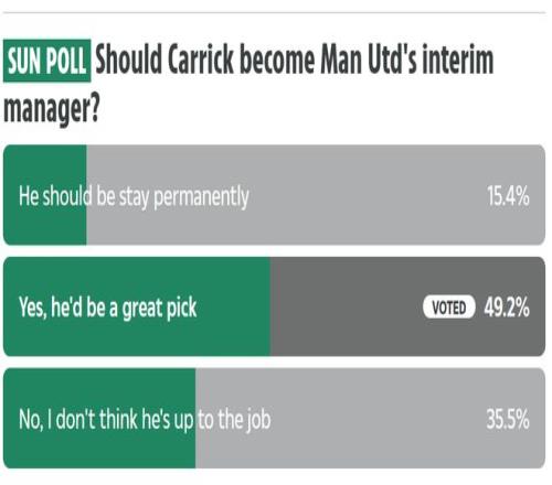 《太陽報》所做的調(diào)查顯示,球迷也對卡里克謹(jǐn)慎看好,接近50%的參與調(diào)查者認(rèn)為,卡里克是曼聯(lián)臨時主教練的上佳人選。