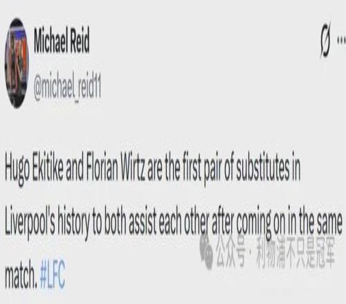 維爾茨和埃基蒂克也成為利物浦隊史第一對替補出場后互送助攻的球員,這兩人之間逐漸擦出火花,對于利物浦在進攻上更有創造力、破密集防守至關重要,本場他倆在替補出場后互送助攻是除了贏球之外最大的欣慰。
