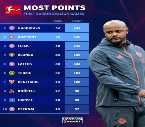 孔帕尼執(zhí)教德甲前50場(chǎng)126分,歷史僅次于瓜迪奧拉