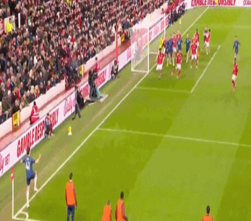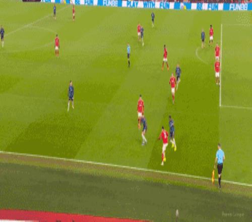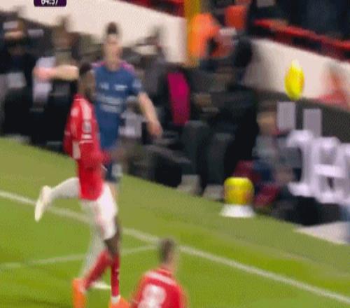 第37分鐘,奧多伊右路拿球高速突破,廷貝爾戰術犯規吃到黃牌。諾丁漢森林眾將索要點球,不過VAR示意犯規在禁區之外,阿森納逃過一劫。