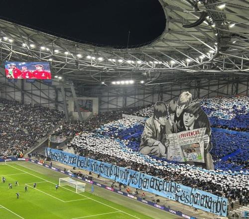 本場比賽在馬賽主場韋洛德羅姆球場進(jìn)行,賽前,球場看臺打出了一幅巨型TIFO,TIFO上畫的是四名年輕男子圍在一起看報紙,明顯致敬的是披頭士樂隊早期形象。