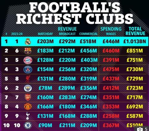利物浦是英超唯一進(jìn)入收入前五的球隊(duì),皇家馬德里成為首支收入突破10億英鎊的俱樂(lè)部,緊隨其后的是巴塞羅那、拜仁慕尼黑和巴黎圣日耳曼。