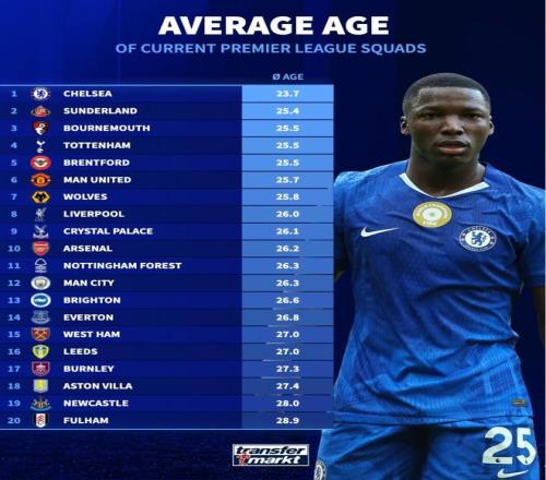 德轉(zhuǎn)統(tǒng)計本賽季英超20隊(duì)平均年齡:切爾西23.7歲最年輕