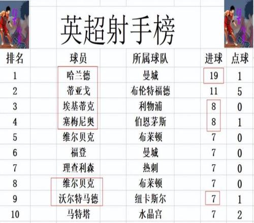射手榜方面,哈蘭德今天打入2球,在射手榜上是一騎絕塵而去,19球高居榜首,領先第2的蒂亞戈8球。埃基蒂克,塞梅尼奧齊破門,8球并列第3。沃爾特馬德梅開二度,追上福登,理查利森等人,將前十門檻提高到7球。