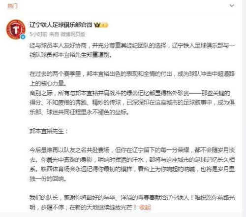 1月9日,遼寧鐵人官宣,隊長邦本宜裕離隊。值得一提的是,此前延邊龍鼎俱樂部先官宣了邦本宜裕加盟。遼寧鐵人俱樂部表示:經與球員本人友好協商,并充分尊重其經紀團隊的選擇,與一線隊球員邦本宜裕先生鄭重道別?!拔覀兊年犻L,感謝你將最好的年華、洋溢的青春奉獻給遼寧鐵人!唯祝愿你前路光明,步履不停,在新的天地繼續綻放光芒!”