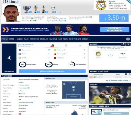 現年27歲的林肯去年夏天從費內巴切以自由身轉會加盟艾華卡,本賽季至今其代表球隊出戰14場葡超比賽,攻進2粒進球并送出3次助攻。德國轉會市場網信息顯示,林肯的身價為350萬歐。