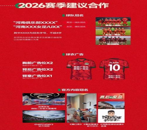 河南足球俱樂部最新發布的官方招商合作公告,2026賽季建議合作中,球衣冠名和球衣廣告(胸前廣告位x2 背后廣告位x1)位列前兩位,官宣了河南隊仍在投資困境中艱難跋涉,讓這支上賽季足協杯亞軍球隊的前景蒙上陰影。