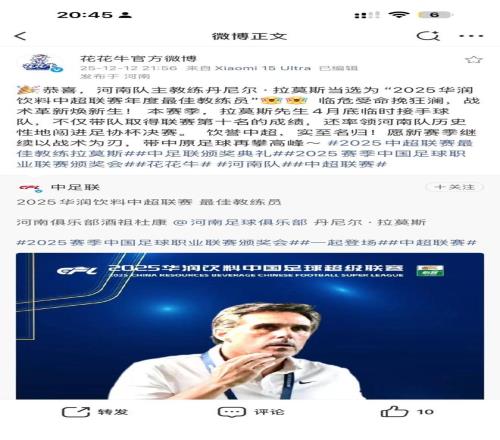 花花牛上一條河南隊相關的微博停留在2025年12月21日