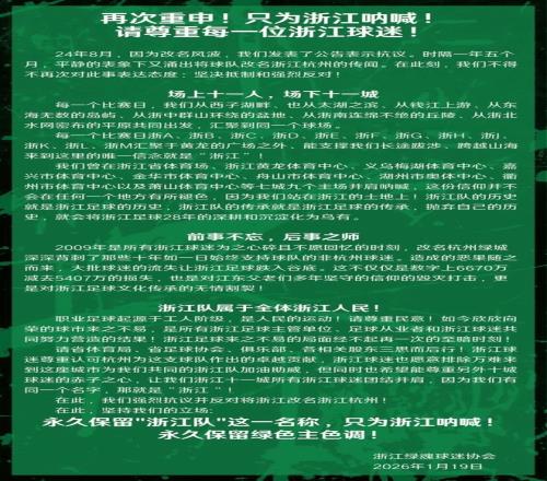 近日,有消息稱中超勁旅浙江隊,新賽季將更名為“浙江杭州隊”。而北京時間1月19日晚,浙江隊知名球迷組織“綠魂”發文以示抗議。